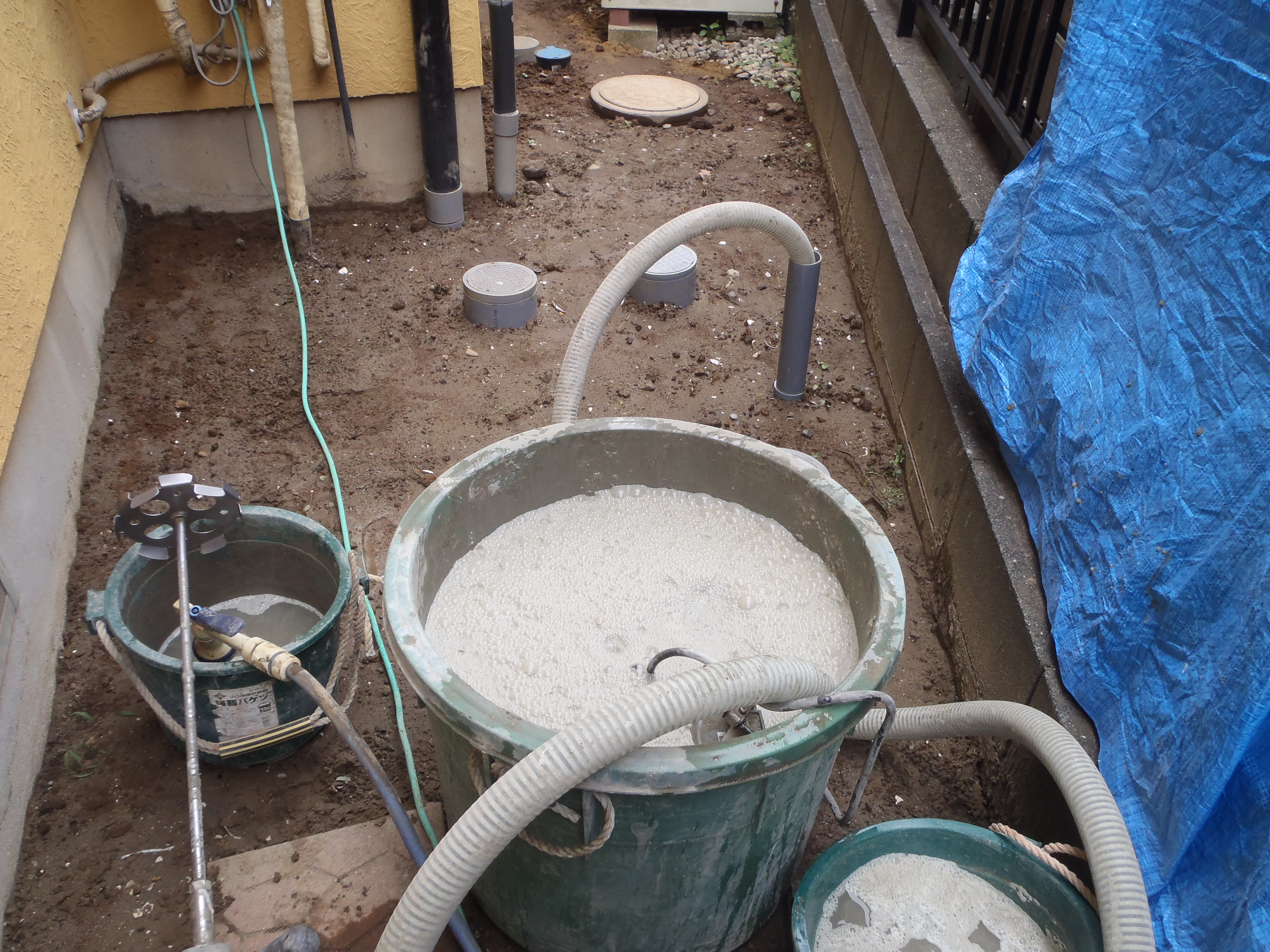 今回は、一戸建て建物の修復&傾きの工事です。古くて劣化している外壁や玄関入口の修復と傾き修正を同時進行で行うことで、作業の効率かと、地盤の緩みを抑える事ができます。地中に入れる装置の設置が遅れてしまうと、掘り起こした部分の地盤が緩んでしまうため、作業はスピードを伴います。掘り起こす部分を最小限にし、設置、穴埋め、薬液を注入し作業は無事終了しました。
