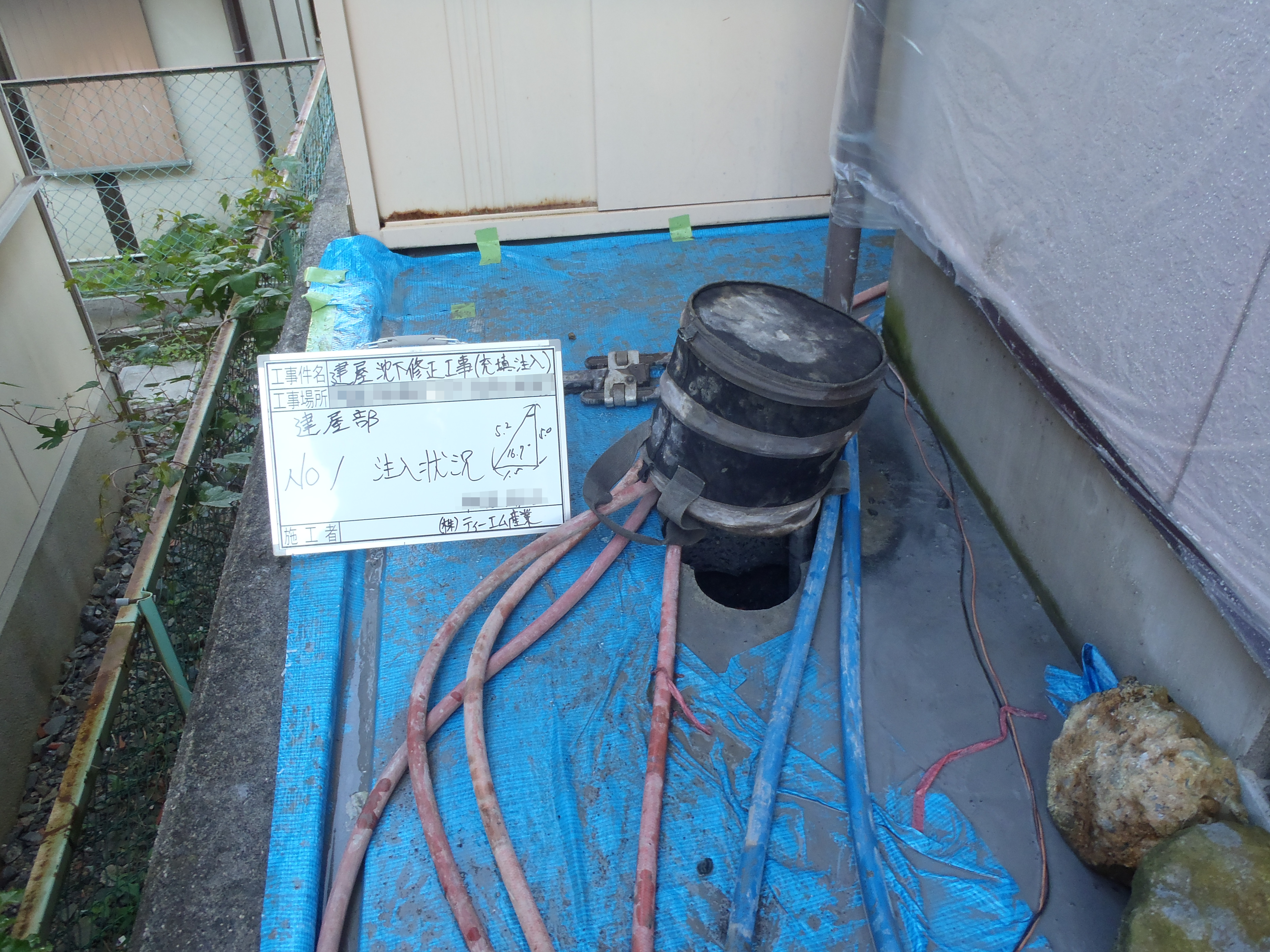 今回は、一戸建ての傾き工事です。 お客様からの依頼により家の傾き調査にお伺いしたところ、室内にて最大沈下数値-158㎜の傾きが発生していることが分かりました。 支持層までブロック杭を圧入する工法を提案し、着工することで、家の傾きを修正することができました。 お客様に弊社をお選びいただいた理由をお伺いしたところ、決め手として「アンダーピニング工法」を挙げて下さいました。