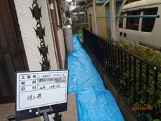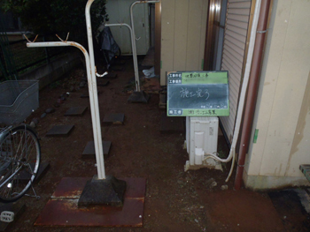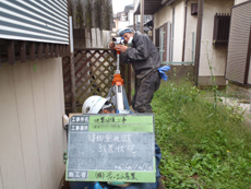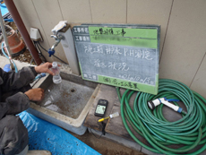 | ポイント確認です。どこに穴を開けるのか決めていきます。 | 建物監視位置を設置しました。 | 井戸水を利用しているお宅でしたので、採水しPHを測定します。 |