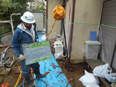 | 地上から約5~10mの深さまで穴を掘ります。 | 注入剤に使用するケイ酸ソーダです。 | 注入剤を流し込み、地盤を強くします。 |